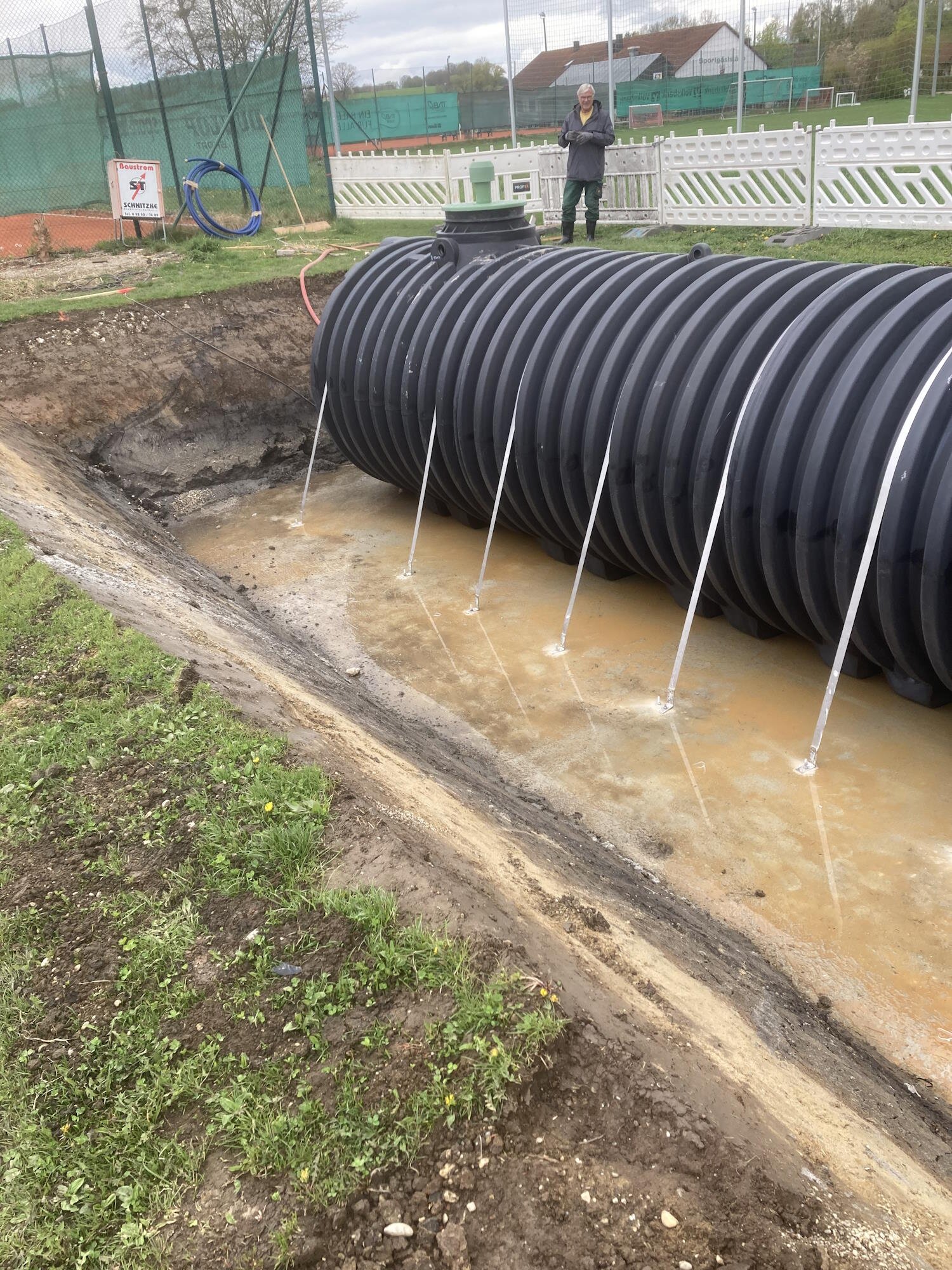 - Ein Kiesfundament bildet eine stabile und drainierende Basis für die Zisterne im Boden. Es sorgt für eine gleichmäßige Lastverteilung und verhindert Schäden.