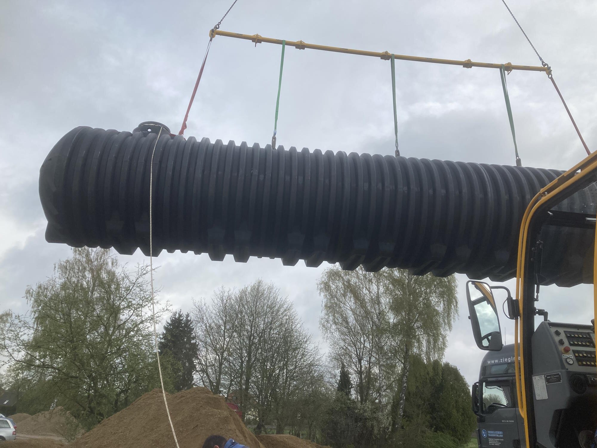 Schritt 3: Einsetzen der Zisterne Heben Sie die Zisterne vorsichtig in die vorbereitete Grube. Bei Betonzisternen ist hierfür in der Regel ein Kran notwendig. Achten Sie darauf, dass die Zisterne exakt ausgerichtet ist und die Anschlüsse in die richtige Richtung zeigen.